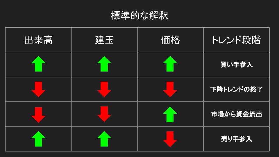 なぜかと言いますと、前述した「価格と出来高と建玉」の標準的な解釈の表を覚えていますか?