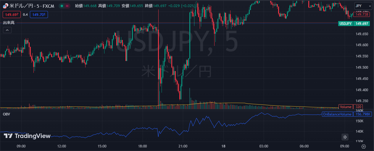 ただし、このOBVもラグが発生しないインジケーターである上に単純な計算方法で表示しているので有効的です。