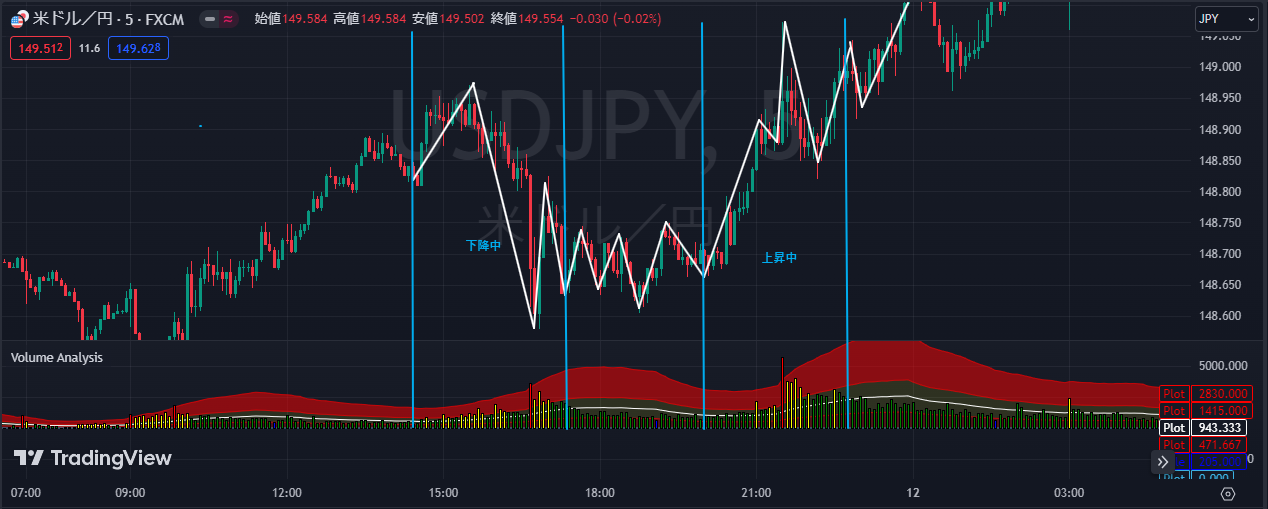 上昇中と書かれた区間内の出来高の方が増加量が飛躍しているのが分かると思います。