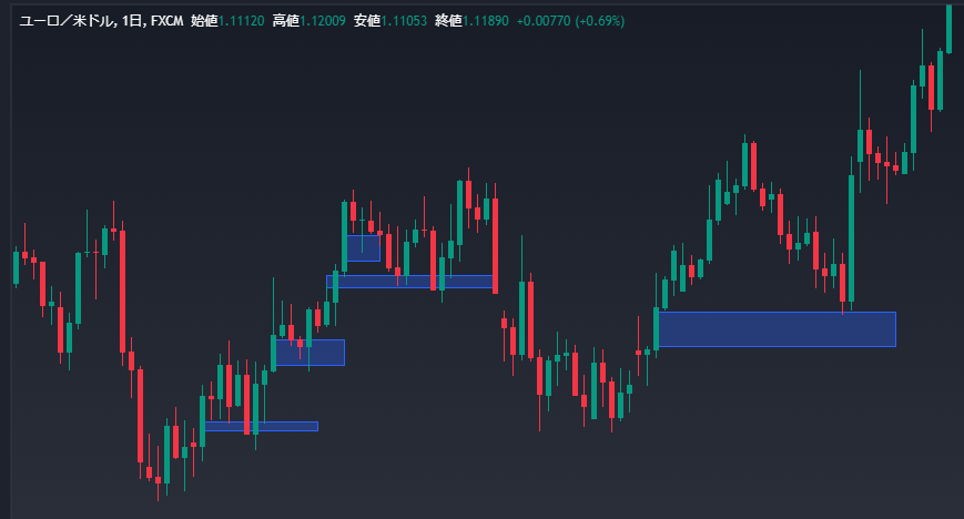 実際にチャートを見てもらうと、EUR/USDの日足で見ると、上昇トレンド中に発生したBullish FVGを一旦埋めてから、再度上昇しているのが分かります。
