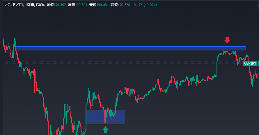 実際のチャートでは、GBP/JPYの1H足で見ても、過去のBearish FVGが未だに埋められておらず、その部分に不均衡が生じていました。
