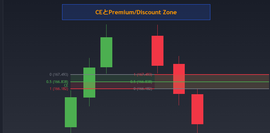 FVG内でフィボナッチリトレースメントを引き、Premium ZoneとDiscount Zoneの境目がCEとなります。