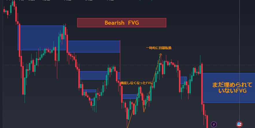 - Bearish FVGは「レジスタンス」として機能する=ショートエントリータイミング