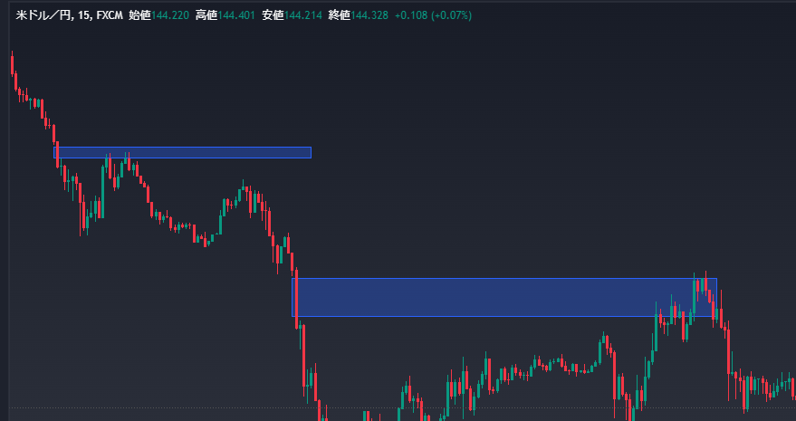 実際にチャートで説明すると、USD/JPYで15M足を見てもBearish FVGまでリトレースメントした時に、反発して再度落ちているのがわかります。