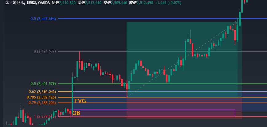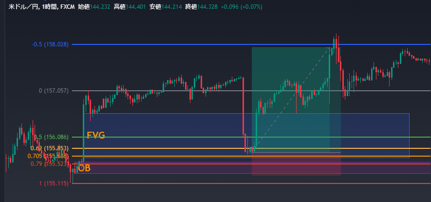 1H足で見れるSwing・LowからSwing・Highまでフィボナッチリトレースメントを置き、大陽線で発生したFVGを探す