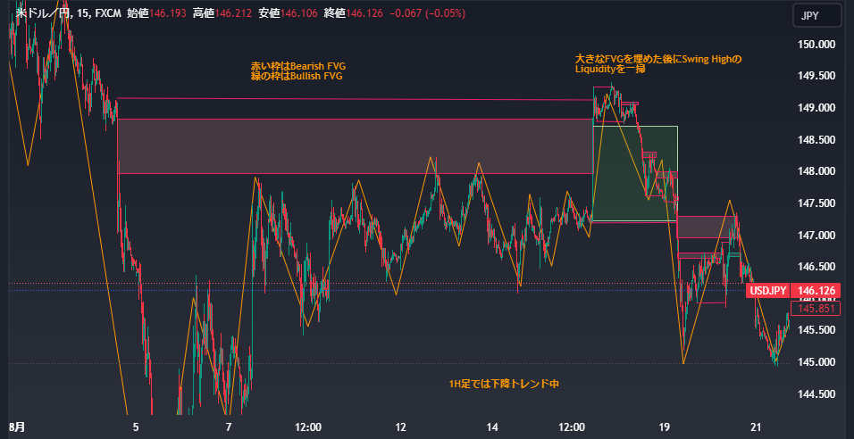 15分足でも見れる大きな下降で発生したFVGを埋めようと、何度も価格が上昇して何度もレジスタンスされているのが分かります。