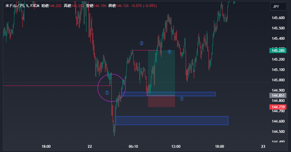 これは、前々日の高値にあるLiquidityを一掃した後でも上昇の傾向が強かったとして、当日のローソク足も陽線のローソク足で確定する予測が立てられます。