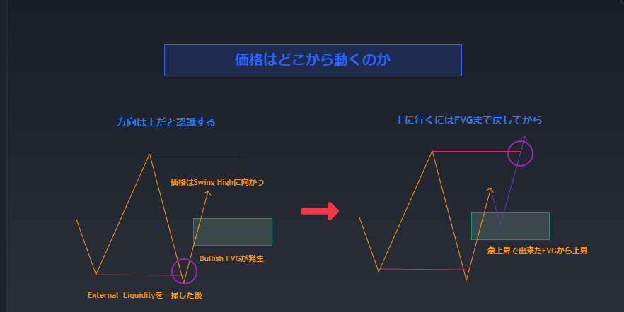 - External Liquidityへ向かう先にどこのFVGに寄り道するのか(Internal Liquidity)= エントリーポイント