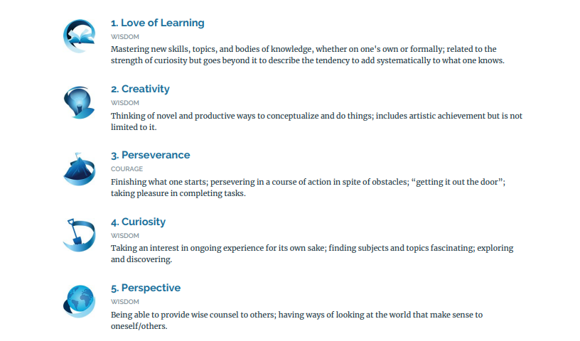 1.知恵の美徳:知識を集め、活用するのに役立つ強み