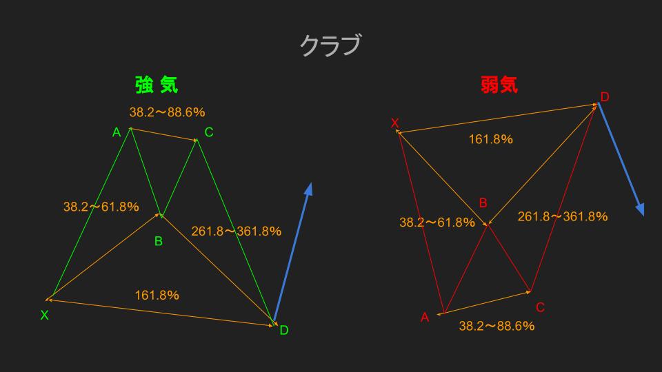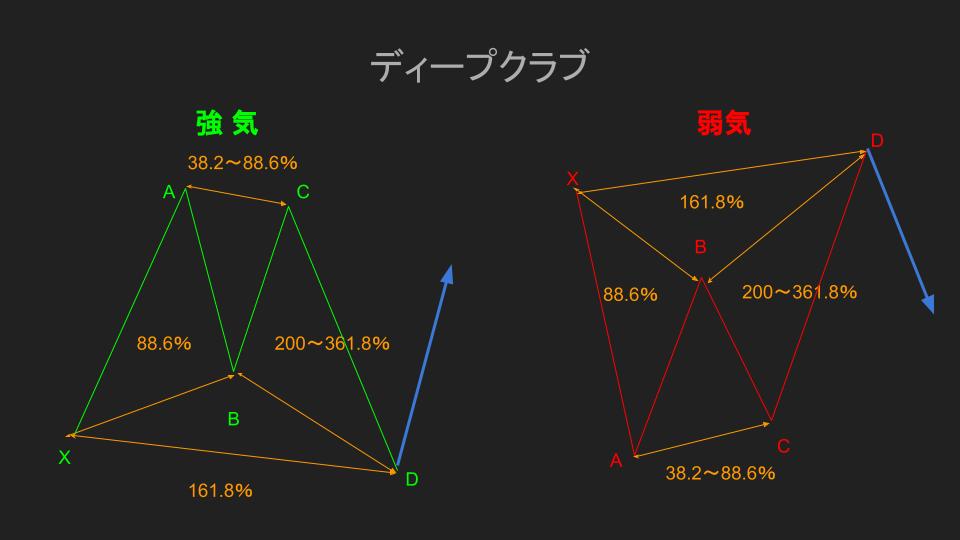 - D点:XAセグメントからのリトレイスメント88.6%かつX点を超えないこと(BCセグメントからのエクステンション161.8~261.8%)