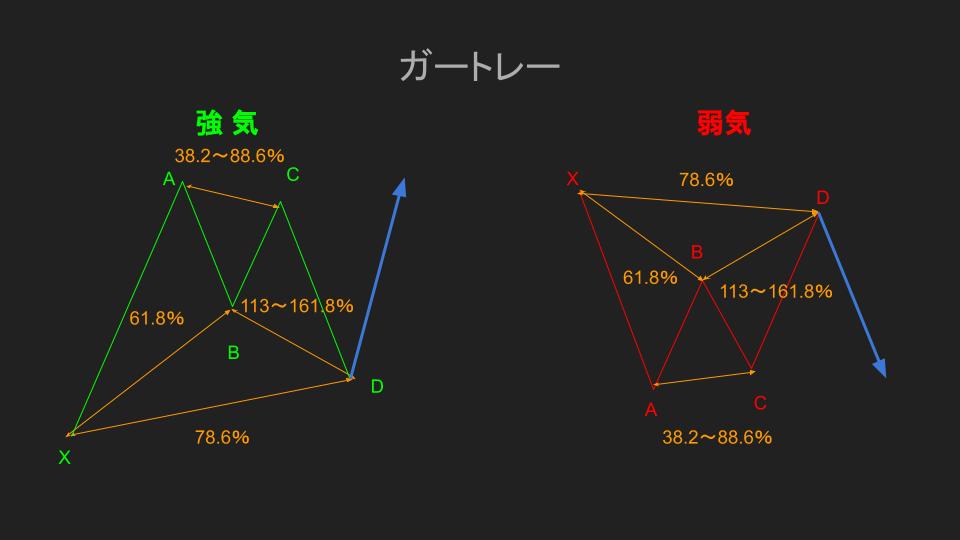 - D点:XAセグメントからのリトレイスメント78.6%かつX点を超えないこと(BCセグメントからのエクステンション127~200%)