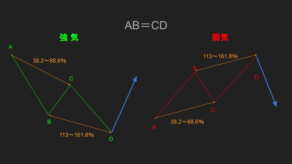 AB=CDは厳密にいうと、汎用性の高いチャートパターンなので、ハーモニックパターンにも当てはまるといった感じです。