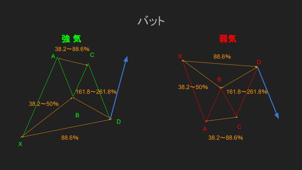 例えば、XAリトレースメントが40%、C点がA点を超えて、D点がX点を超えず、BCエキステンションが88.6%付近ならバットという形になります。