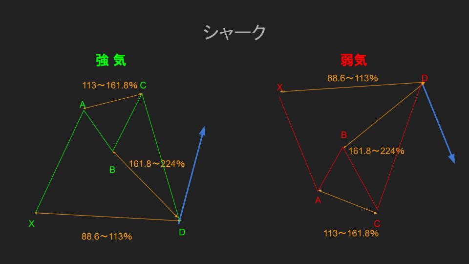 このシャークの特徴はまず、B点のリトレースメントは特段決まりがない事です。