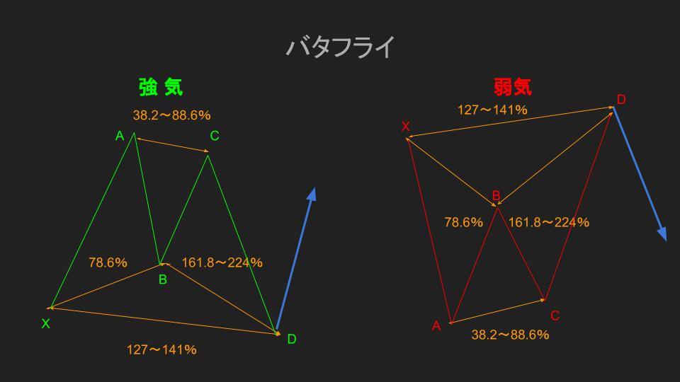 この形の名前の由来は蝶に見立てているからなんですが、このバタフライの特徴として、XAセグメントに対してのリトレースメント(ABセグメント)が深いのが分かると思います。