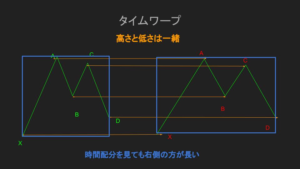 次にハーモニックパターンは、実際のチャート上では教科書通りに示すことはなく、横軸の価格変動時間は考慮してないという点です。