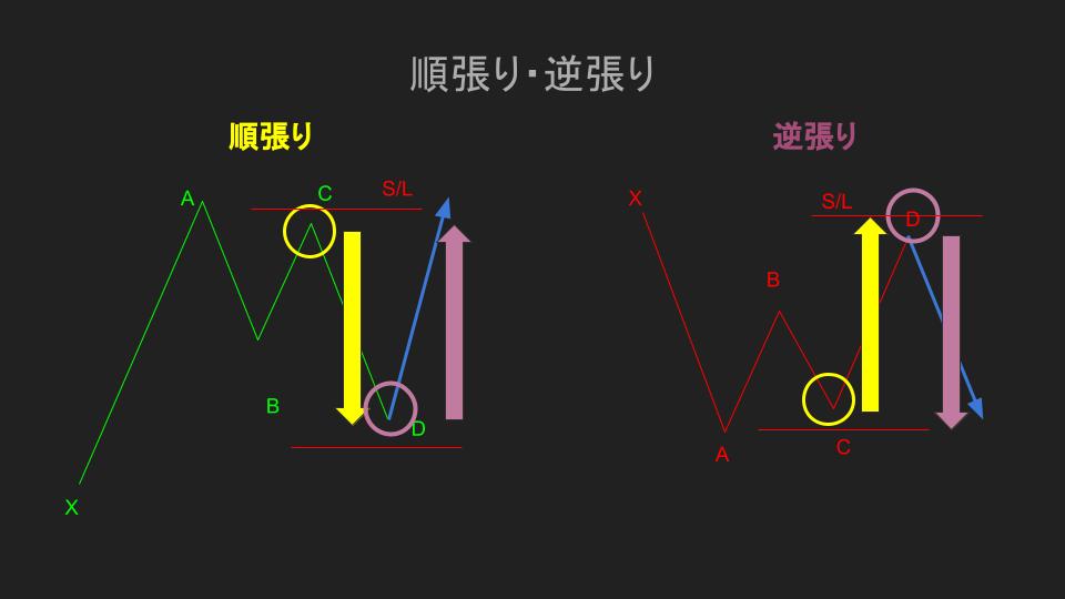 オススメなのは、D点を予測して逆張りを狙う方法と、C点が確定してからパターンに沿ってリスクリワードを設定して順張りする方法です。